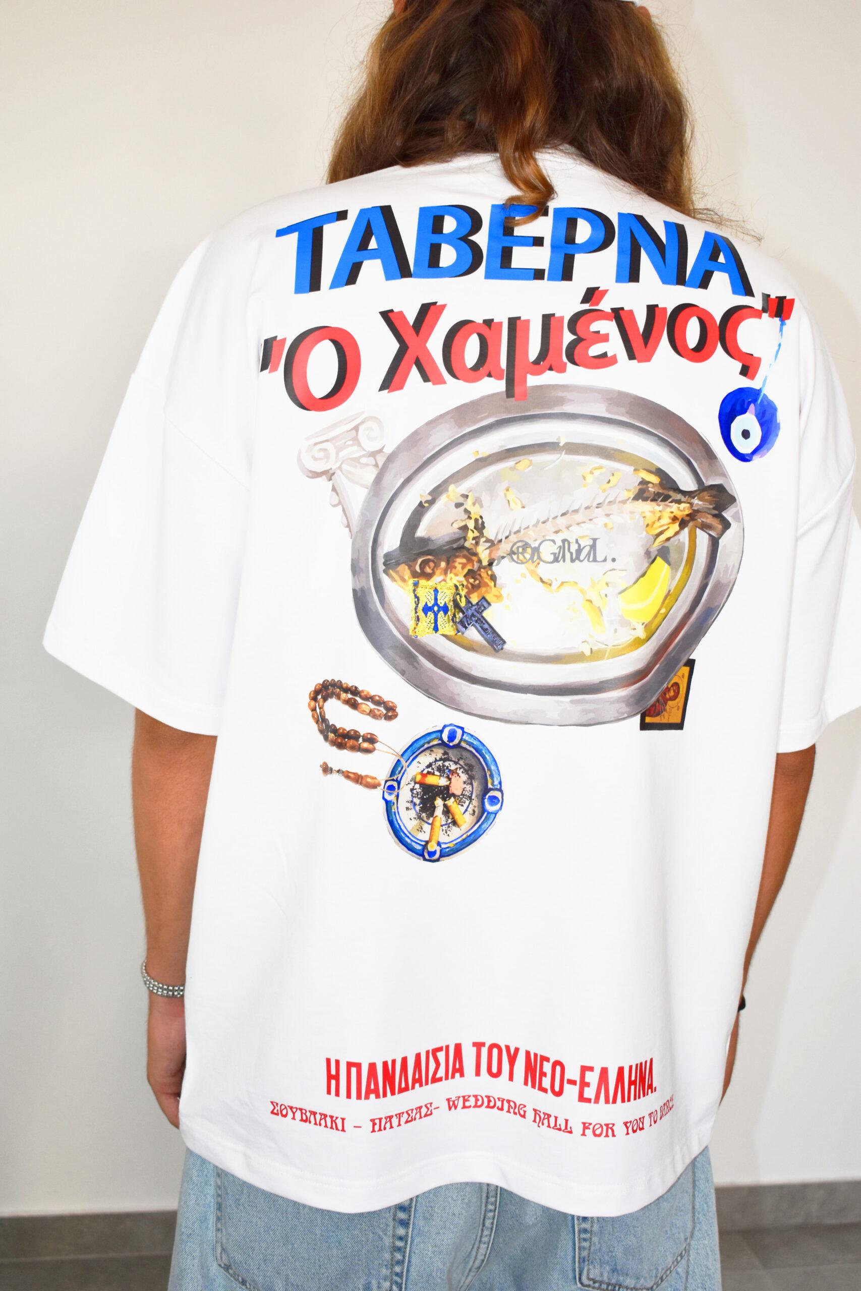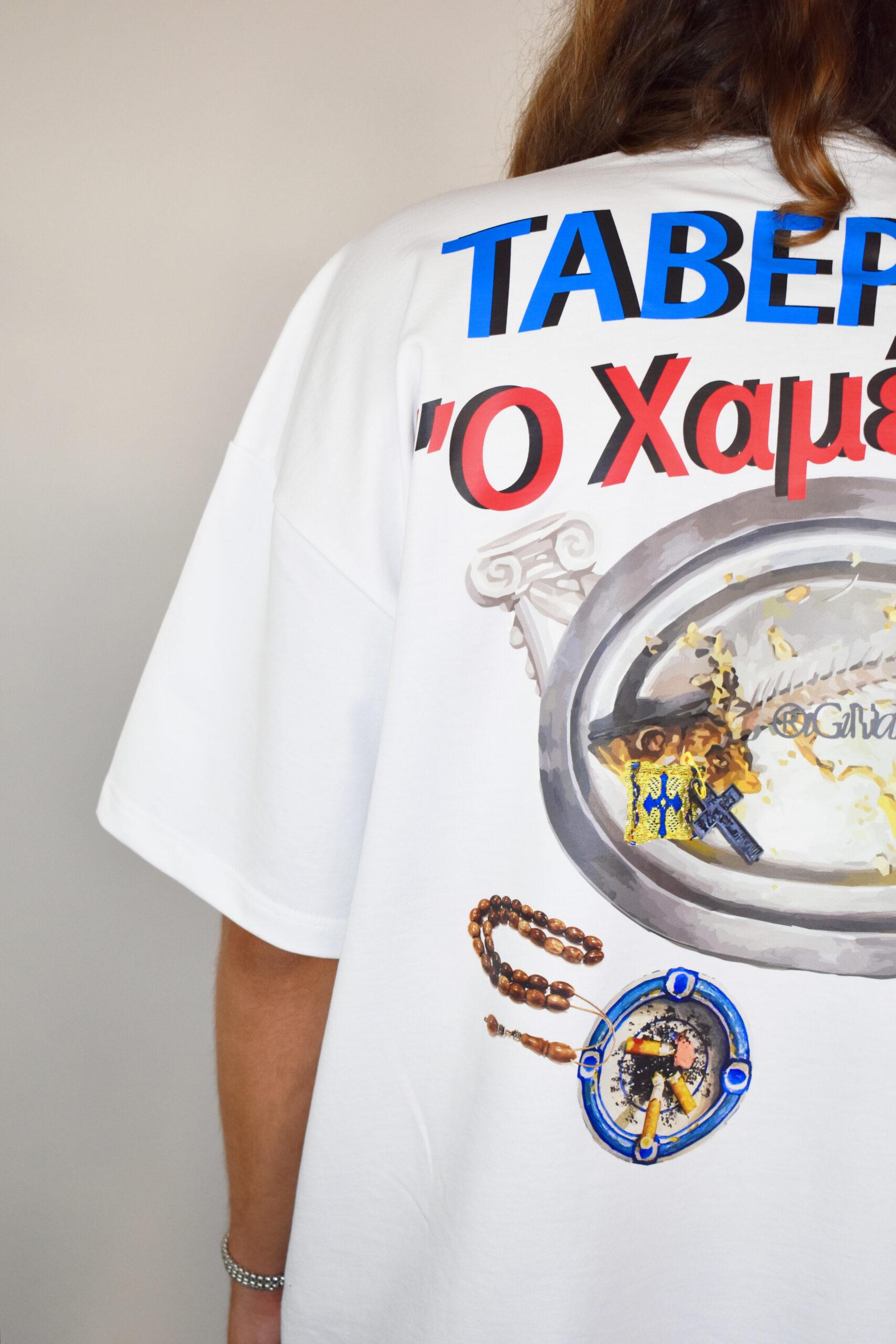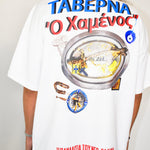 A ouzo toast to what’s left of tradition. Our 1st Product + The Lost Kids Tavern Tshirt is a tongue in cheek tribute to the Greek taverna culture or now half memory, half souvenir stand. Featuring a bold graphic of a classic taverna face and the tagline “Lost Tavern”, it pokes fun at how we’ve turned our culture into a postcard (and we’re selling it back to ourselves). Made from soft, ethically sourced cotton, this tee is a wearable eye-roll at tourist kitsch.