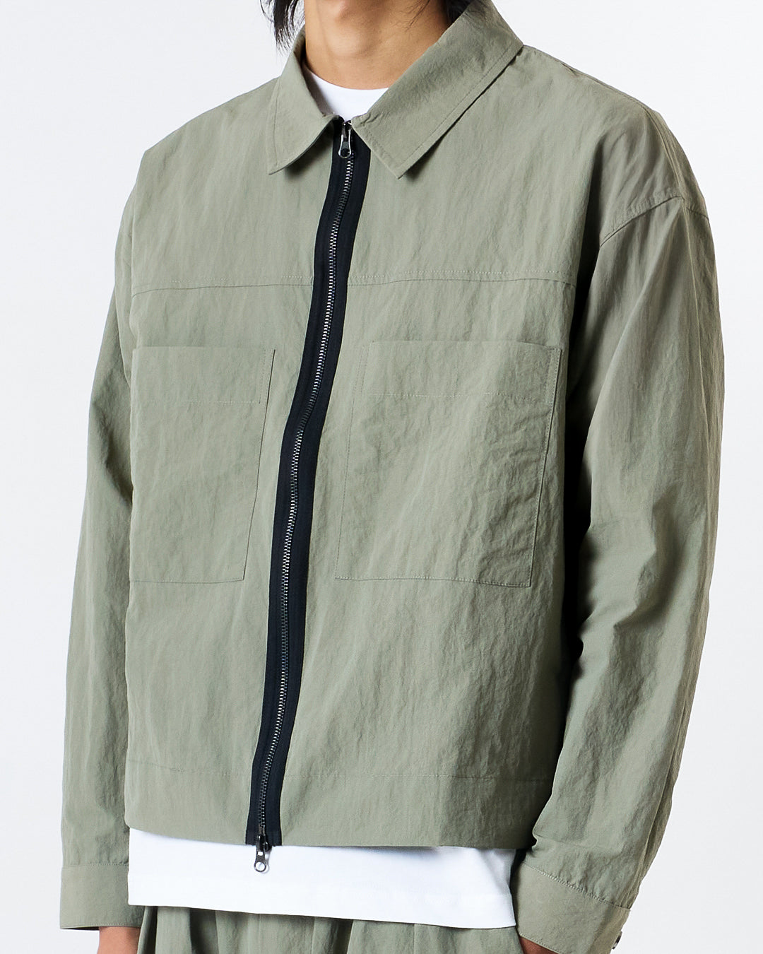 CANDICE Air nylon jacket in sage green, made from a lightweight nylon fabric with a crumpled texture. Featuring large front pockets, black metal two-way zipper and strapping and custom CANDICE hardware. An un-lined layering piece with a notably cropped, boxy fit.
