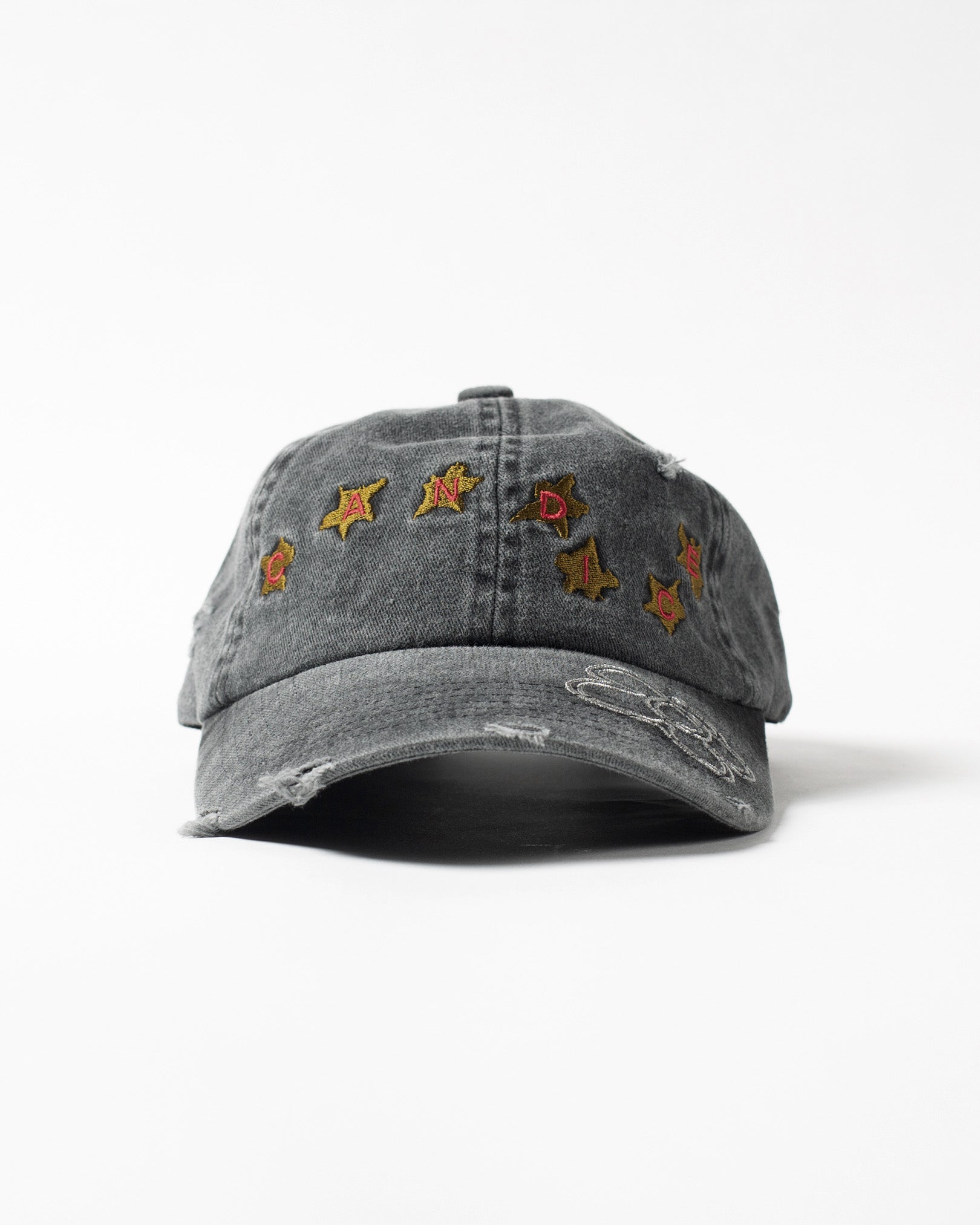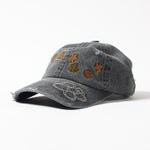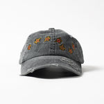 The Candice bloom hat in charcoal, a 6 panel hat made from a washed cotton twill fabric. Featuring embroidery on front and peak, with distressed tears all over. Low profile fit.