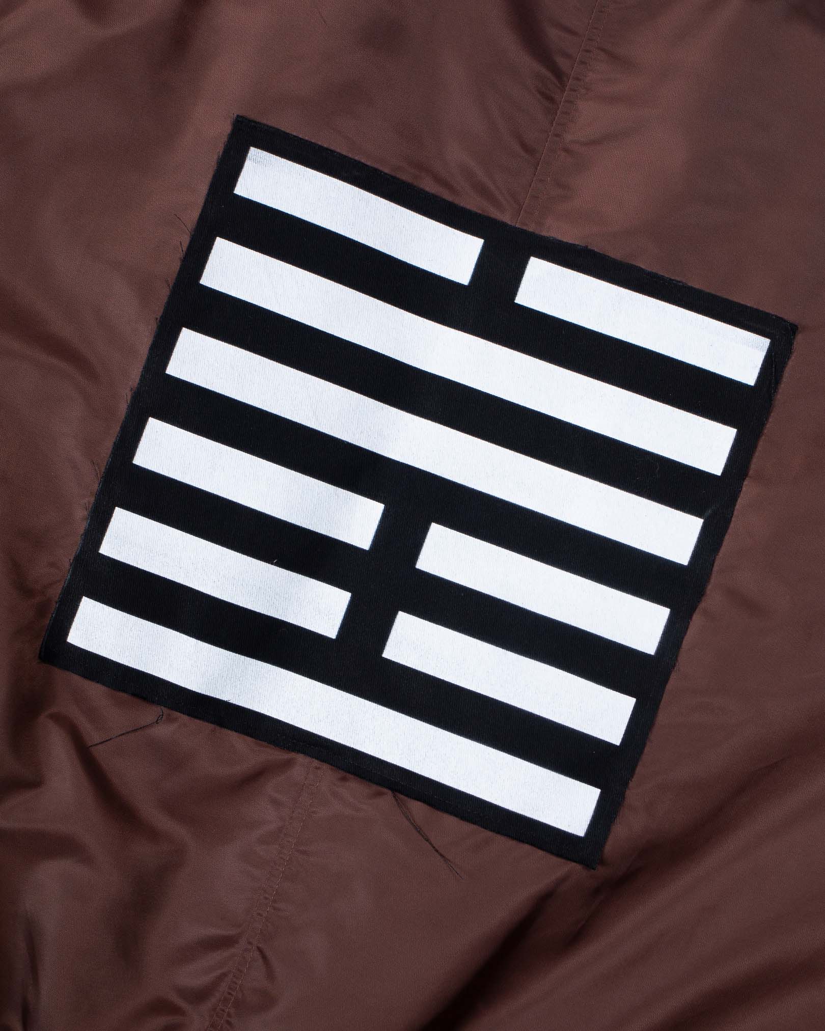 and sleeves. Large printed raw-edge patch on the back. Finished