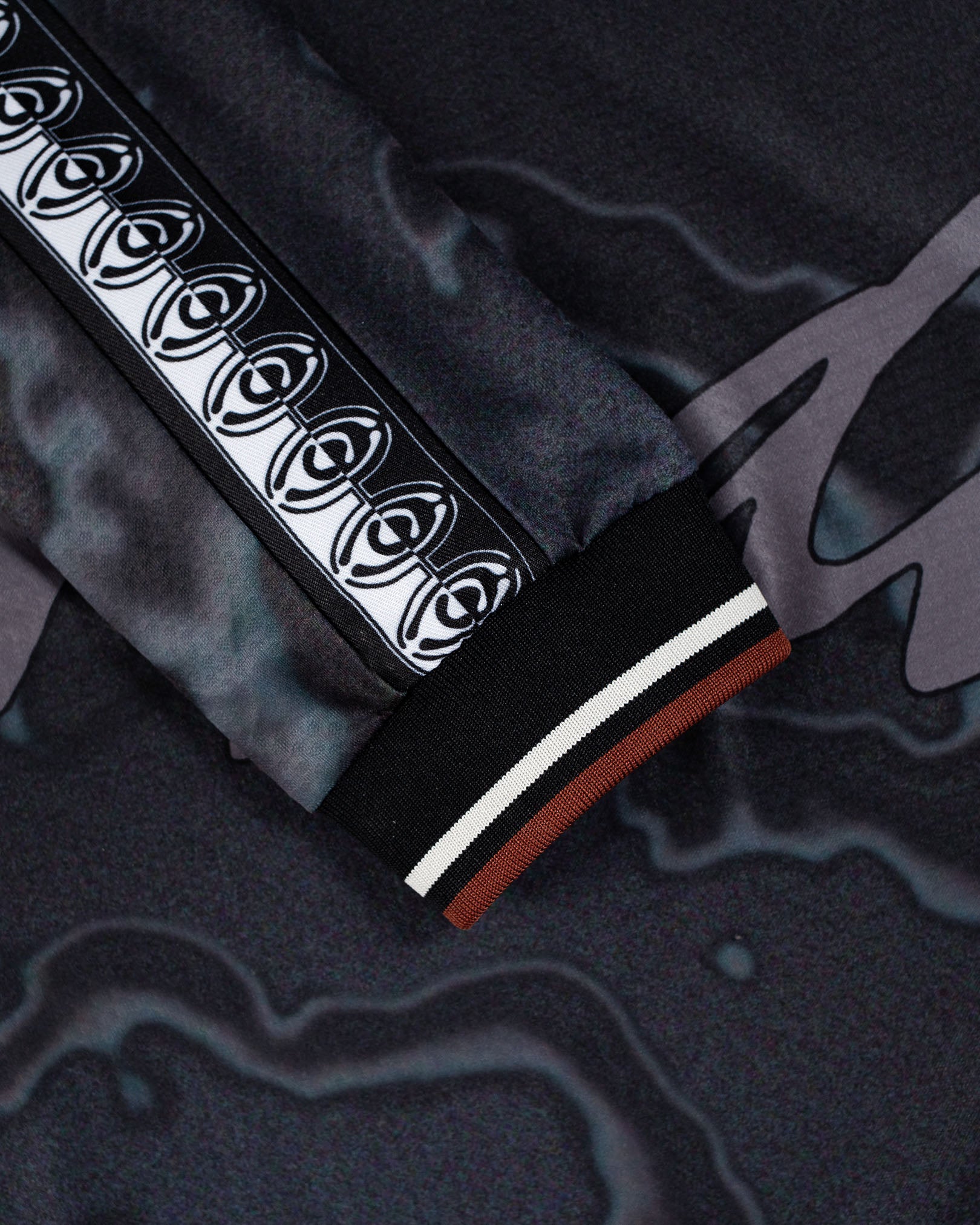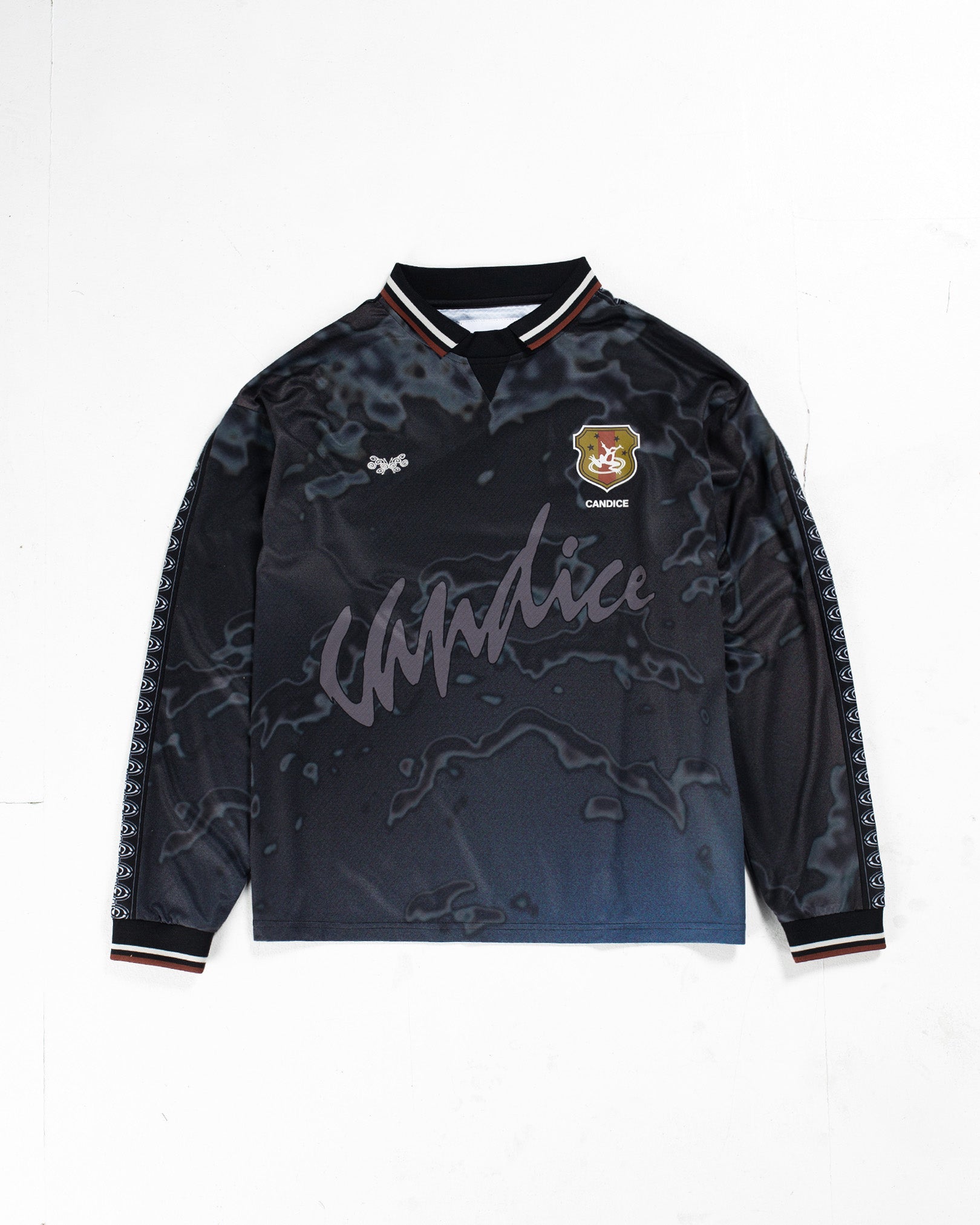 The Candice Frog Dreaming Football Jersey, made from a breathable midweight polyester perfect for the field or street. Features all over sublimation printed pattern, embroidery and heat pressed shield on front. Printed sleeve taping down the sleeves and tri tone striped ribbed cuffs and collar.