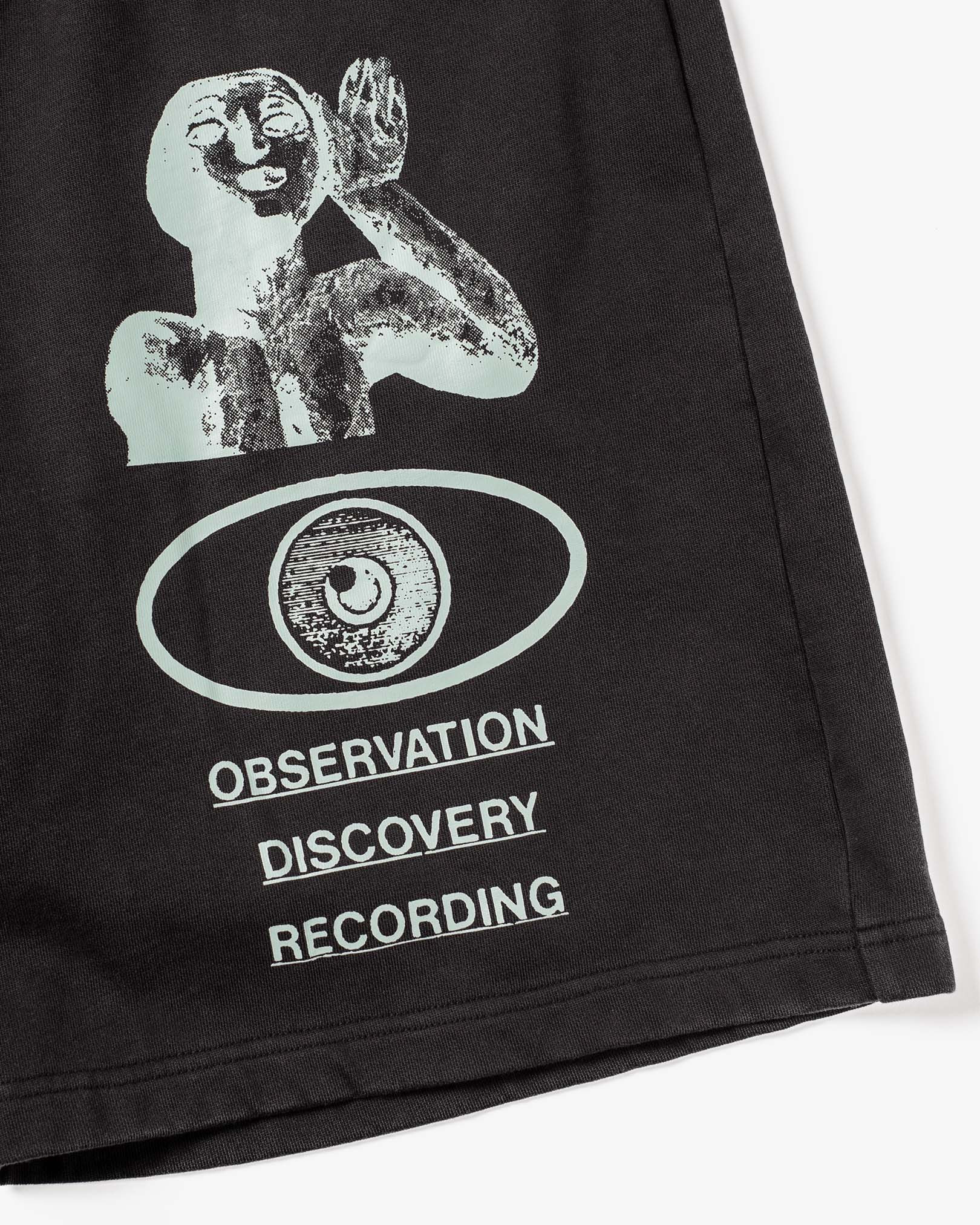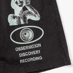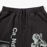 The CANDICE journey shorts in Black, made from a comfortable french terry cotton fabric with a washed effect for a vintage, worn-in look. Featuring an elastic waist with drawstrings and large screen prints down front legs. A baggy, below-knee fit.