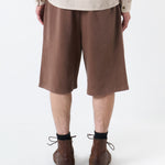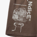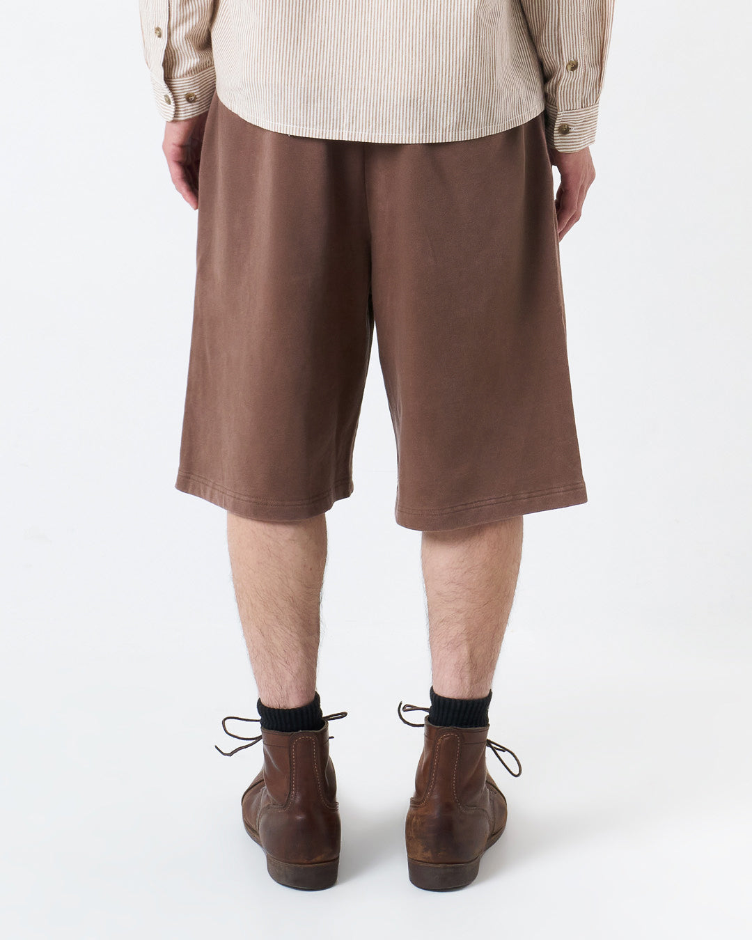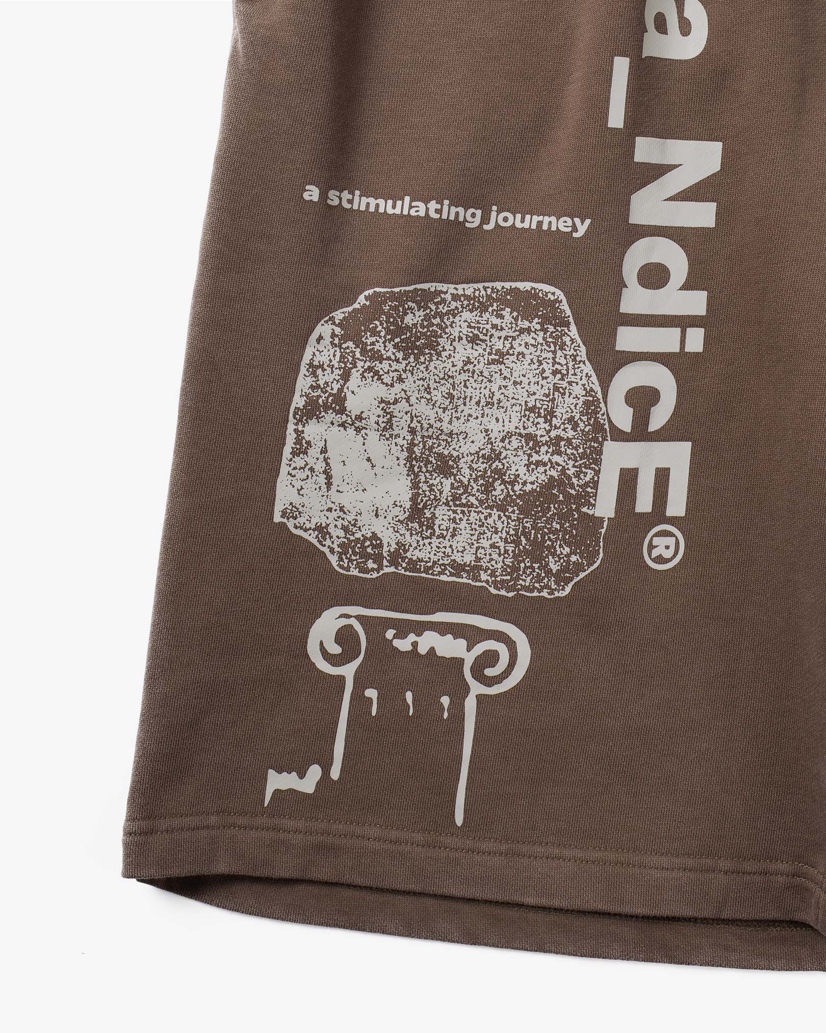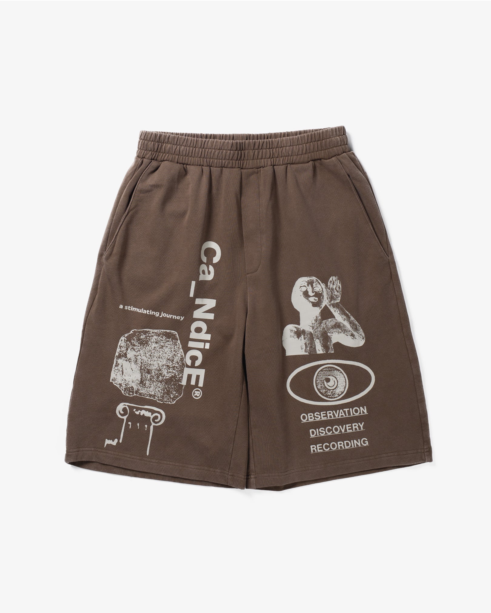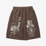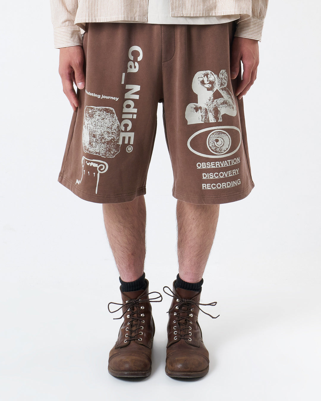The CANDICE journey shorts in Brown, made from a comfortable french terry cotton fabric with a washed effect for a vintage, worn-in look. Featuring an elastic waist with drawstrings and large screen prints down front legs. A baggy, below-knee fit.