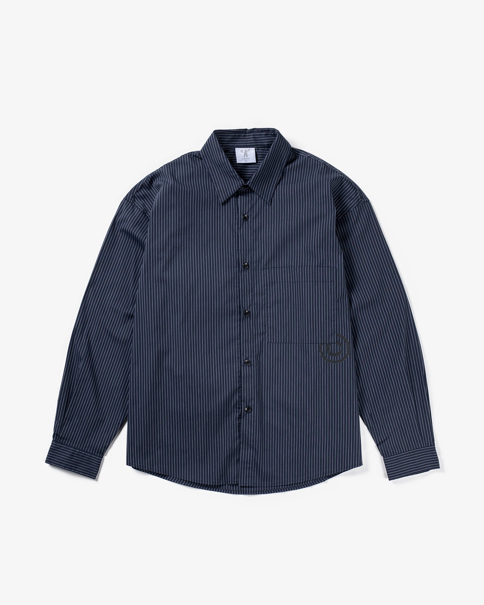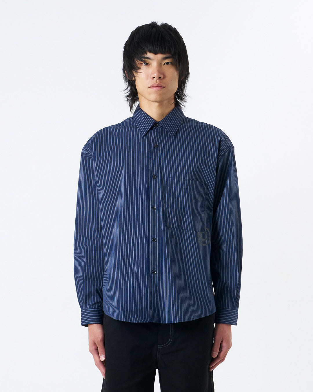 The latest CANDICE Kirwans shirt in navy, made from a lightweight and super comfortable striped cotton fabric. Features all-over graphic printing and signature logo embroidery at hem. A slightly oversized fit with a rounded hem.