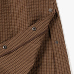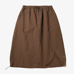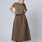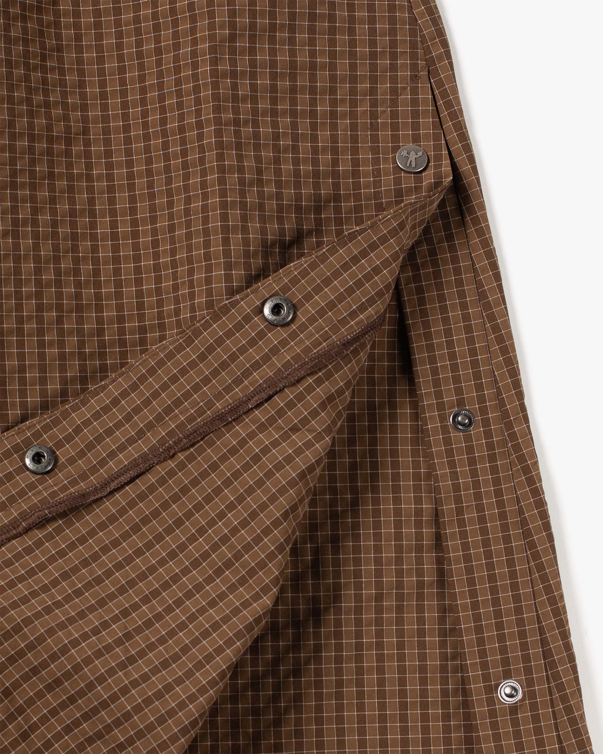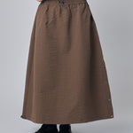 CANDICE Murray Skirt, made from a brown plaid patterned fabric. Features snap buttoned side opening and drawstring at the hem. Two side pockets at the front. Finished with adjustable elastic waistband and drawstring tightener.