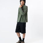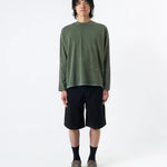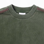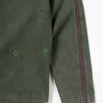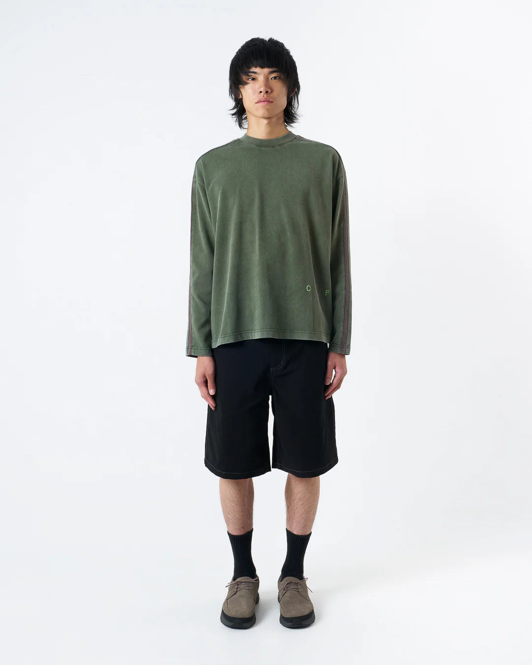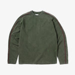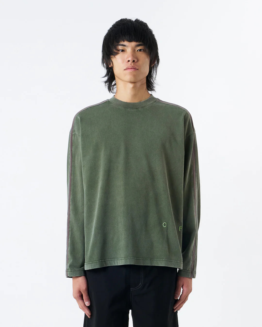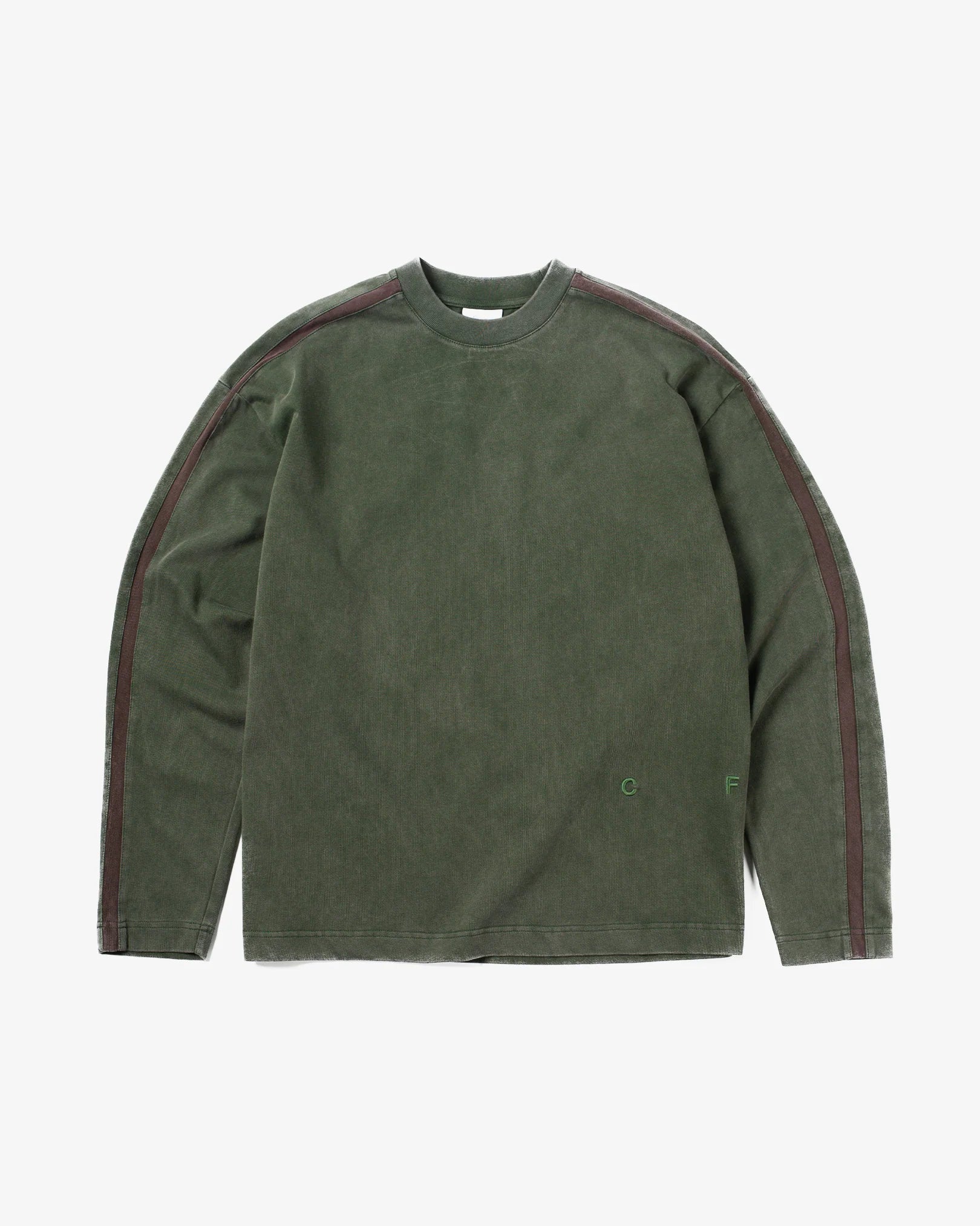 The Candice Racer long sleeve tee in green, made from a heavy 280gsm French Terry cotton fabric, garment washed for vintage effect. Features a cropped boxy, fit and front-side embroidery. Finished with racer stripe panels down the sleeve.