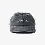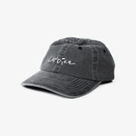 The CANDICE Signature hat in charcoal, a 6 panel hat made from a washed cotton twill fabric with contrasting green stitching. Featuring front embroidery and white stitching. Finished with cotton strap