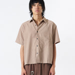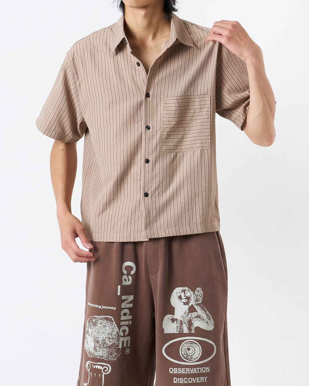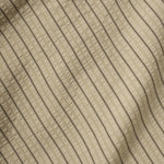 The CANDICE Taverna shirt in tan, made from a light weight, textured and breathable fabric with a striped woven pattern. Features brown marbled plastic buttons and a cropped, boxy fit.