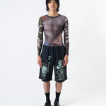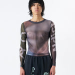 The CANDICE Transient Mesh Top in a extra lightweight and breathable polyester mesh fabric. Features overlocked stitching on all seams and graphic printing. Finished with red woven label on back. Unisex cropped, elasticated silhouette.
