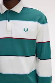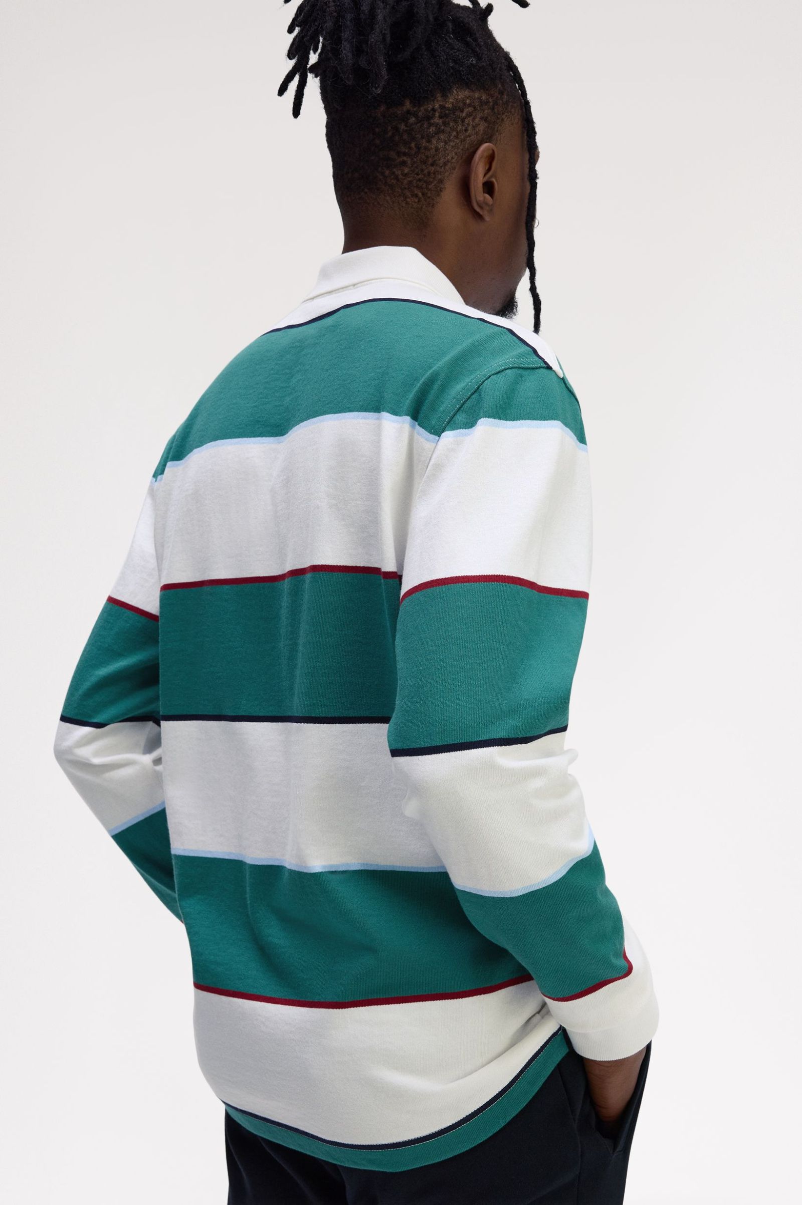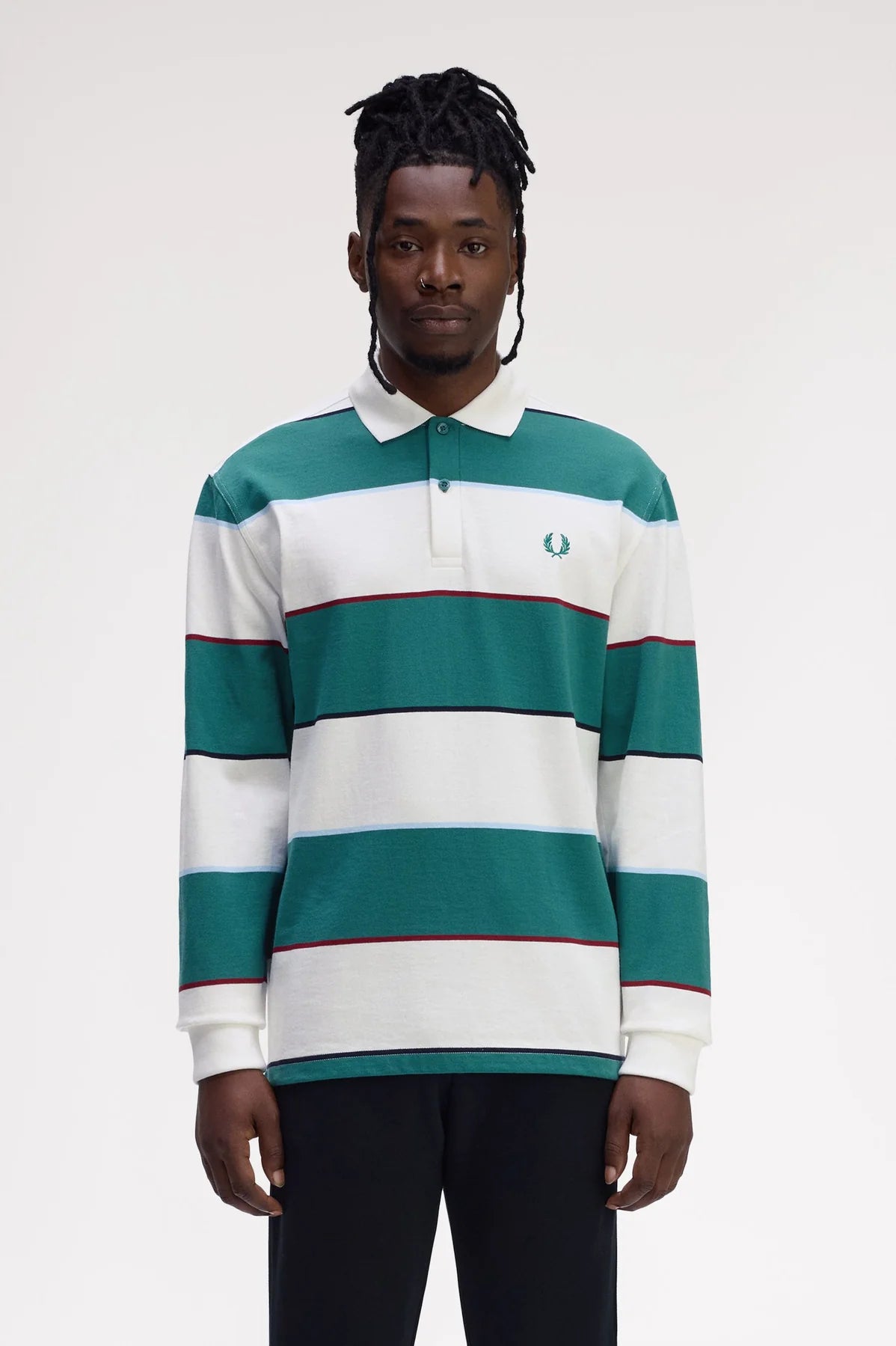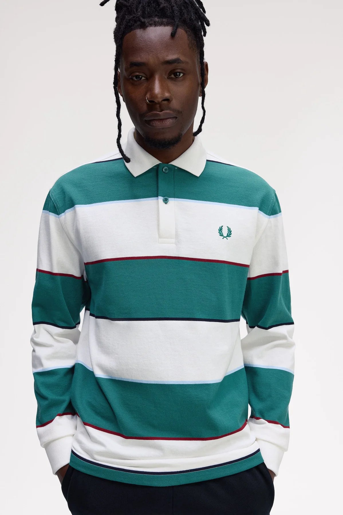 An icon on the tennis court and later the face of British subculture, this Fred Perry Polo Shirt is inspired by Rugby shirts. Cut from a heavyweight cotton jersey, an all over stripe pattern and embroidered Laurel Wreath complete the design.