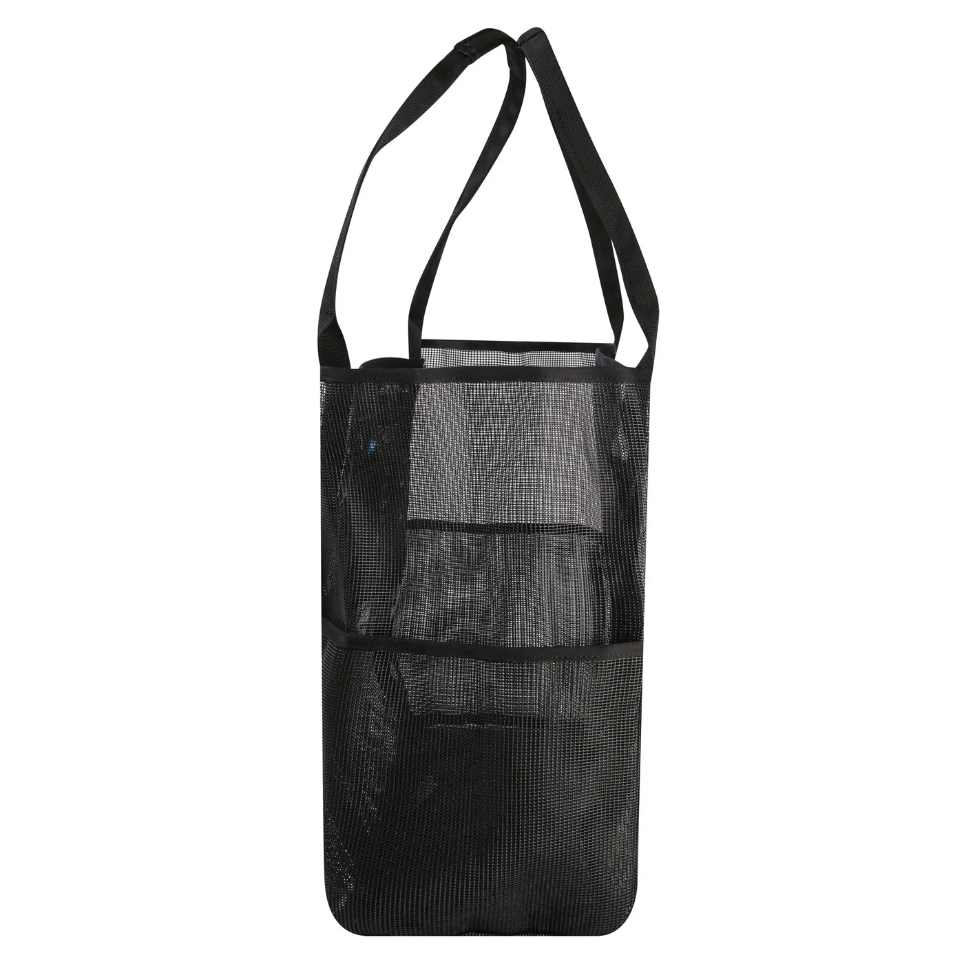 Stand alone large mesh tote with pockets galore, fixed / pinched webbing shoulder straps, one main compartment with contrast binding, one exterior stash pocket with pattern webbing detail, four additional surrounding slip pockets with contrast binding, internal hanging zip and slip pocket, interior seam binding.