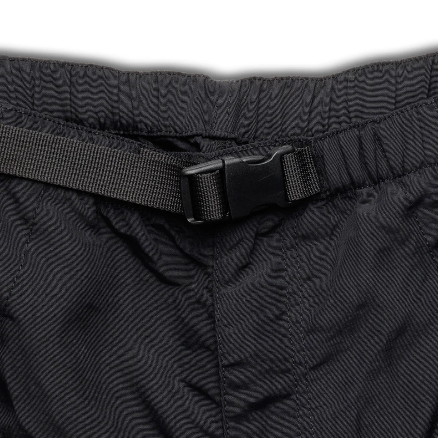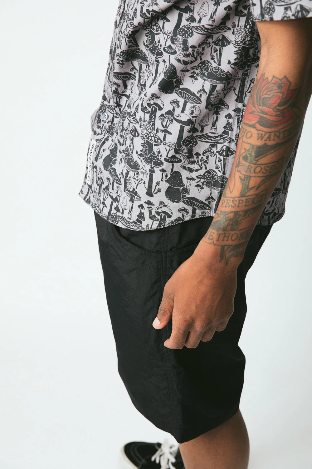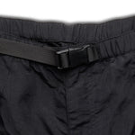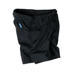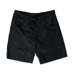 Loose fit, elastic waist short with rubberized snap and zip fly, built in ¾" nylon webbing belt with side release buckle, half-moon pockets with right rear internal wallet stay, mesh pocket bags, gusset, double needle reinforced seams.