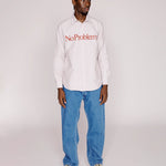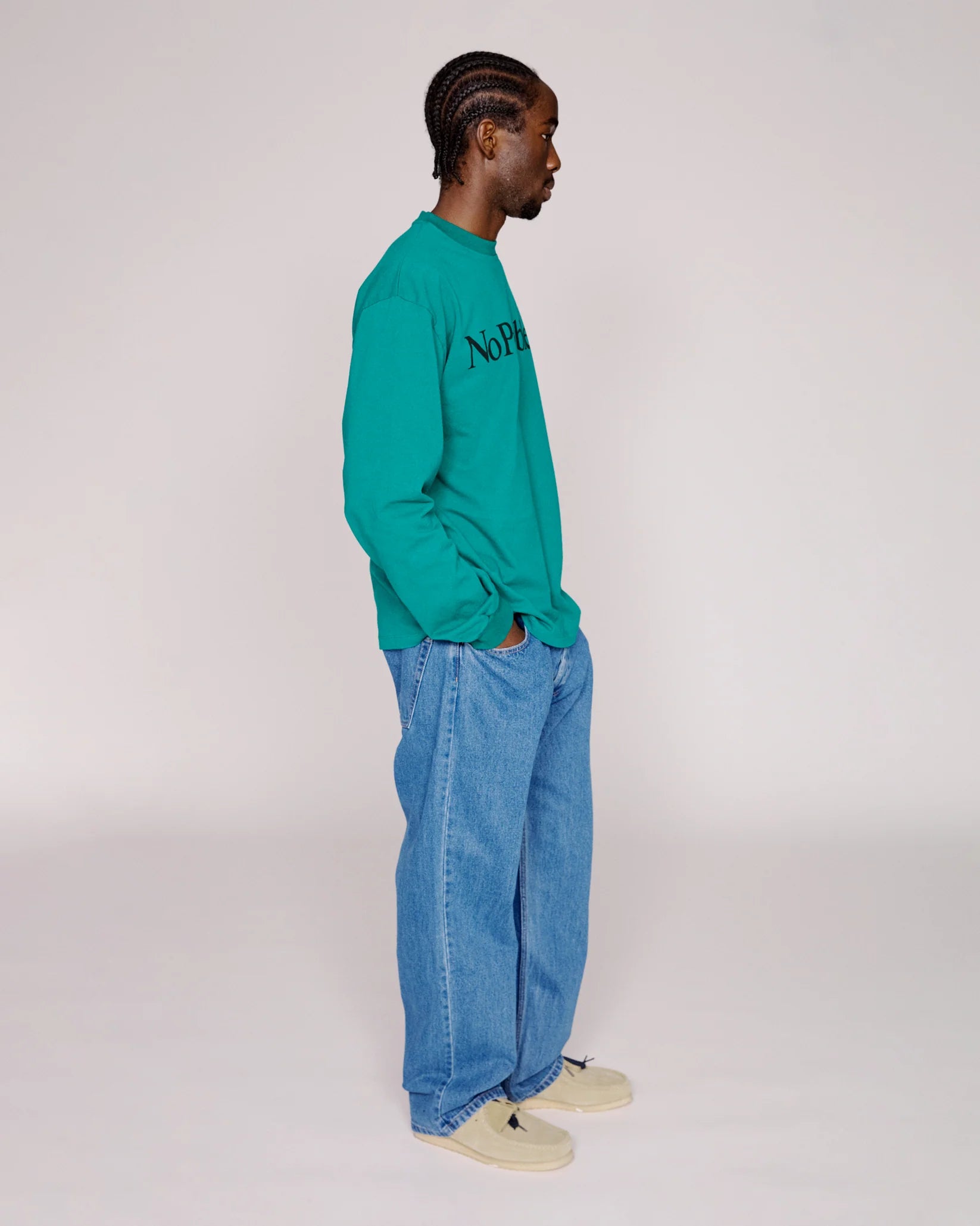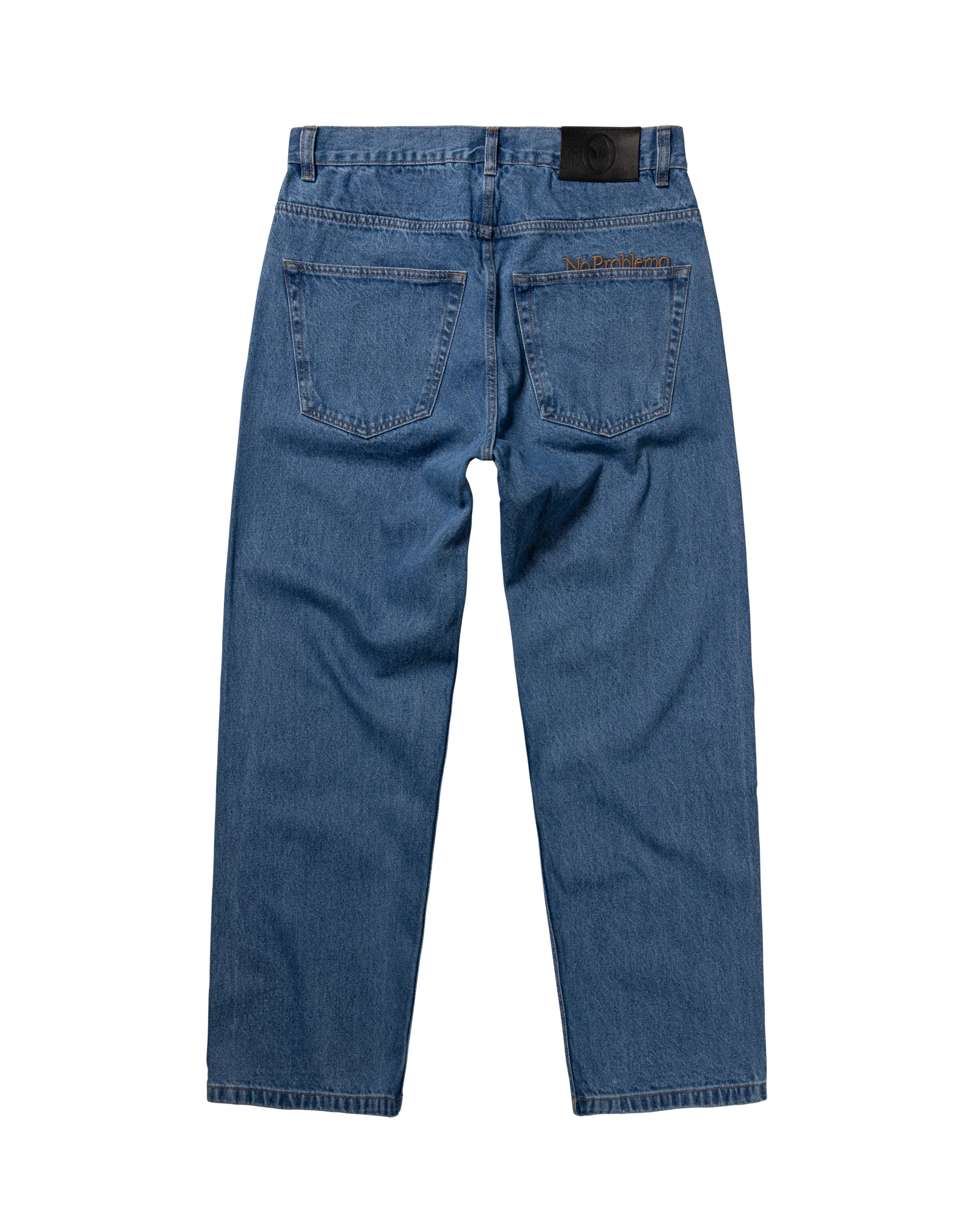 NP unisex vintage-cut 90s style skate jeans, meant to be worn super baggy.made out of 100% cotton denim.featuring a no problemo embroidery on the back, alien-o leather patch and branded button.
